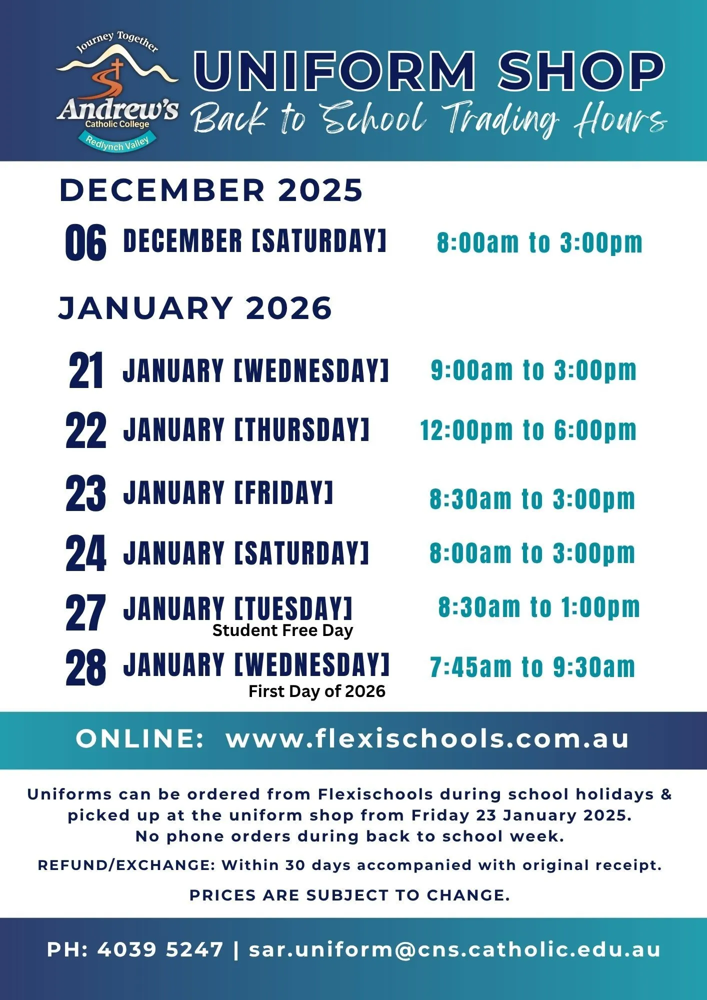 Located outside O Block, the Uniform Shop sells the full range of formal and sports uniforms and a selection of second hand uniform items.